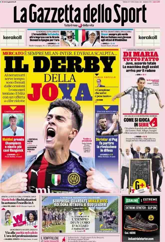 La rassegna stampa di Calciomercato.it vi propone i titoli principali sulla prima pagina di oggi, sabato 2 luglio 2022, de ‘La Gazzetta dello Sport’.