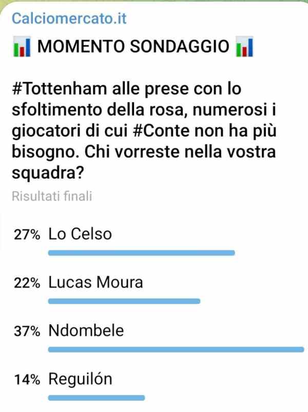 E per farlo gli Spurs dovranno completare diverse cessioni e sfoltire la rosa, dopo che qualche colpo importante è già stato piazzato, l’Inter ne sa qualcosa e ci riferiamo a Ivan Perisic. Insomma, le ambizioni ci sono e le idee sono chiare. Oggi ne abbiamo parlato attraverso il sondaggio pubblicando sul nostro profilo Telegram e i nostri utenti hanno fatto una scelta piuttosto chiara.