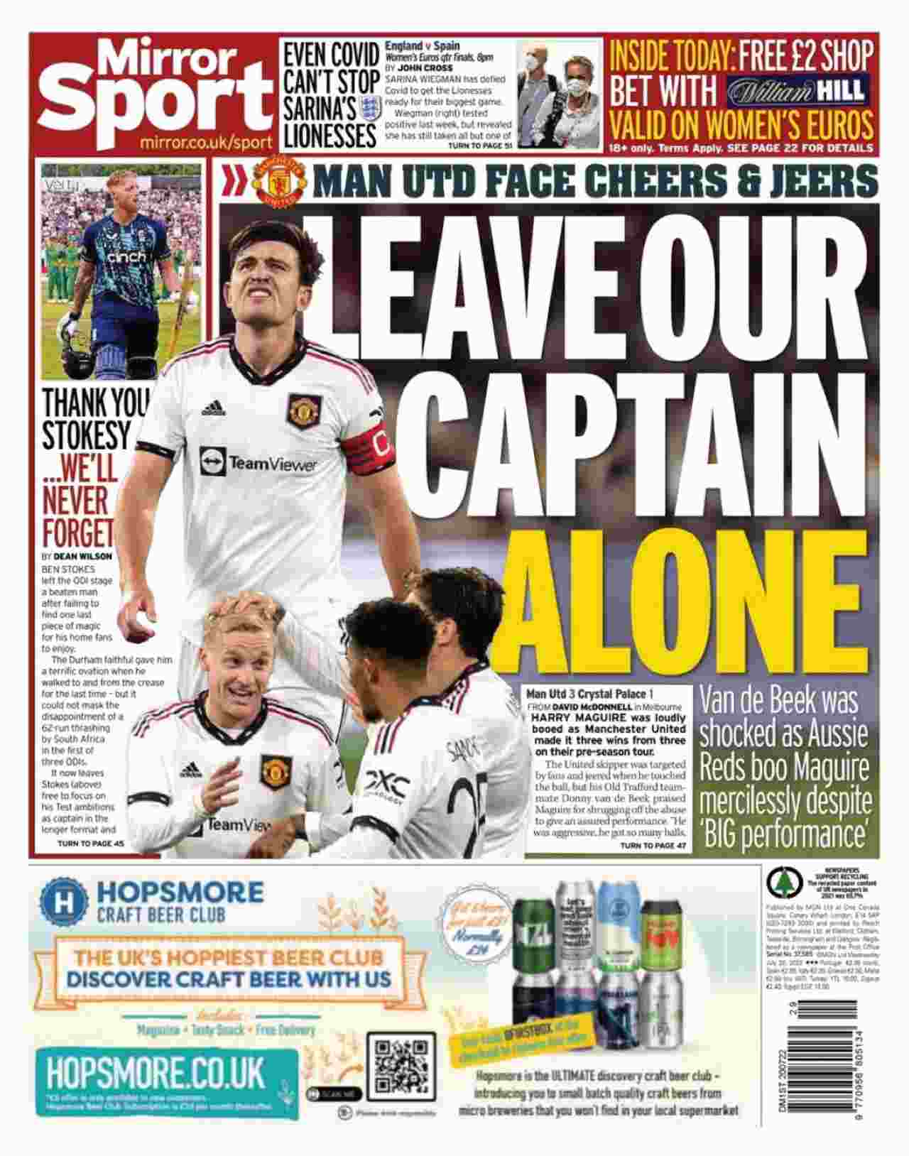 La rassegna stampa di Calciomercato.it vi propone i titoli principali sulla prima pagina di oggi, mercoledì 20 luglio 2022, del ‘Mirror Sport’.