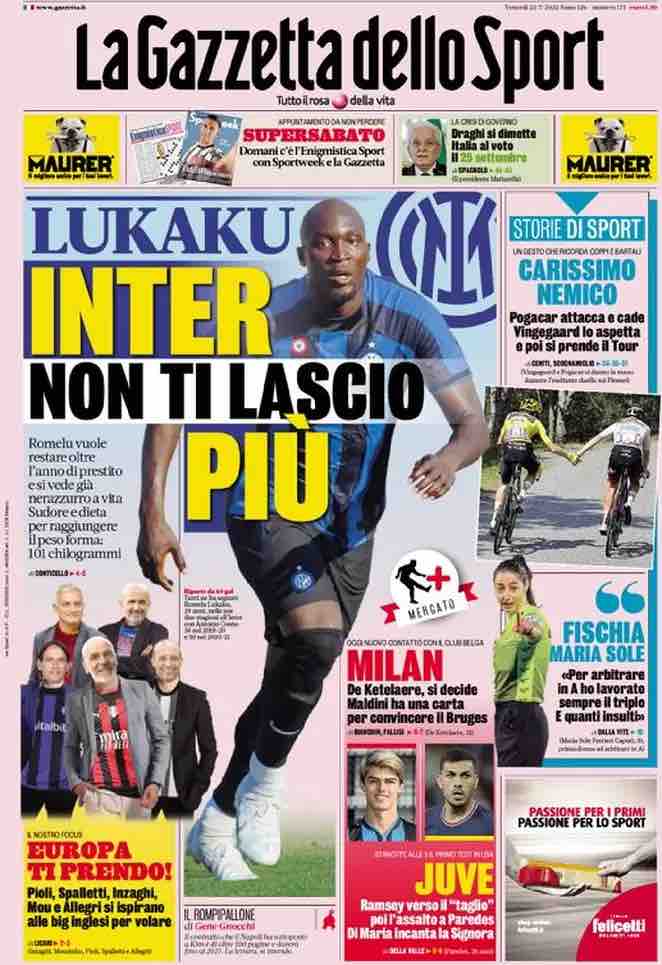 La rassegna stampa di Calciomercato.it vi propone i titoli principali sulla prima pagina di oggi, venerdì 22 luglio 2022, de ‘La Gazzetta dello Sport’.