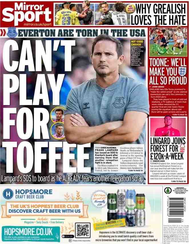 La rassegna stampa di Calciomercato.it vi propone i titoli principali sulla prima pagina di oggi, venerdì 22 luglio 2022, di ‘Mirror Sport’.