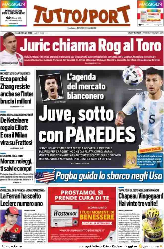 La rassegna stampa di Calciomercato.it vi propone i titoli principali sulla prima pagina di oggi, venerdì 22 luglio 2022, di ‘Tuttosport’.