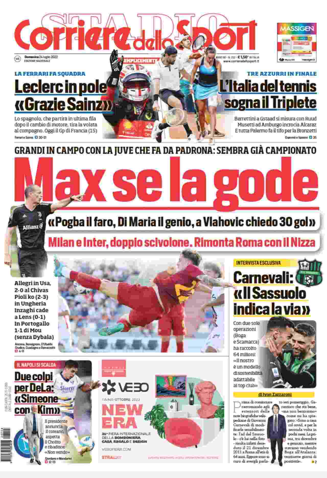 La rassegna stampa di Calciomercato.it vi propone i titoli principali sulla prima pagina di oggi, domenica 24 luglio 2022, del ‘Corriere dello Sport’.