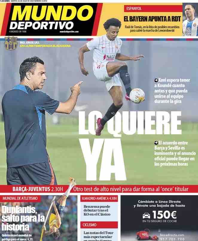 La rassegna stampa di Calciomercato.it vi propone i titoli principali sulla prima pagina di oggi, martedì 25 luglio 2022, del ‘Mundo Deportivo’.