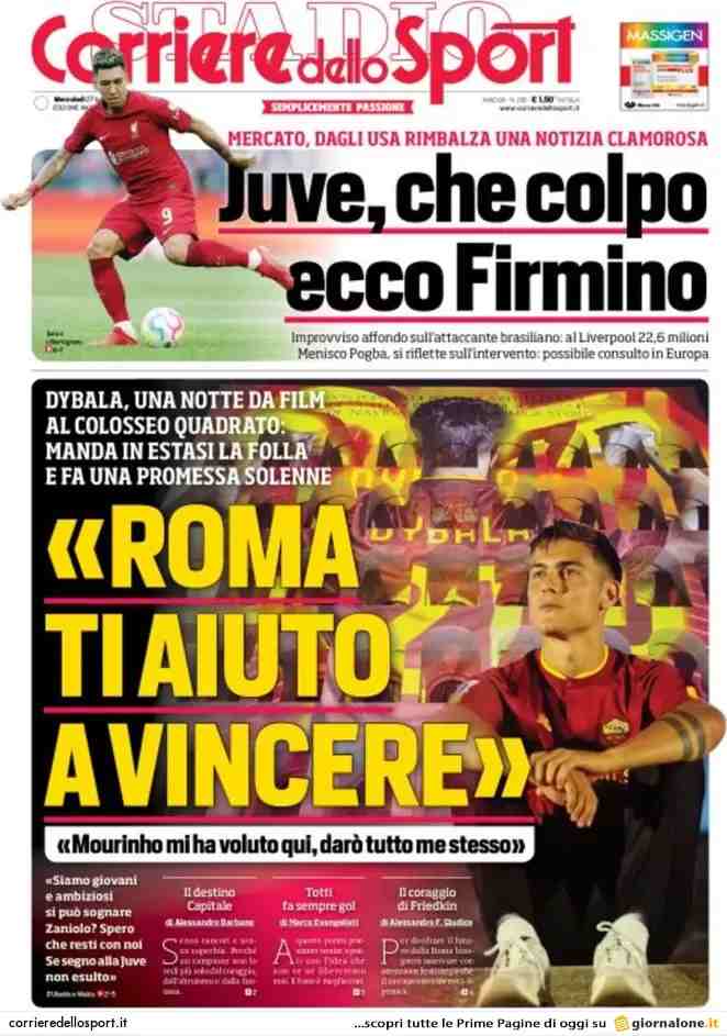 La rassegna stampa di Calciomercato.it vi propone i titoli principali sulla prima pagina di oggi, mercoledì 27 luglio 2022, del ‘Corriere dello Sport’.