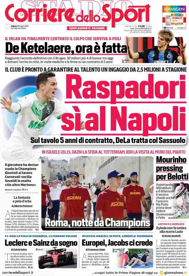La rassegna stampa di Calciomercato.it vi propone i titoli principali sulla prima pagina di oggi, sabato 30 luglio 2022, del ‘Corriere dello Sport’.