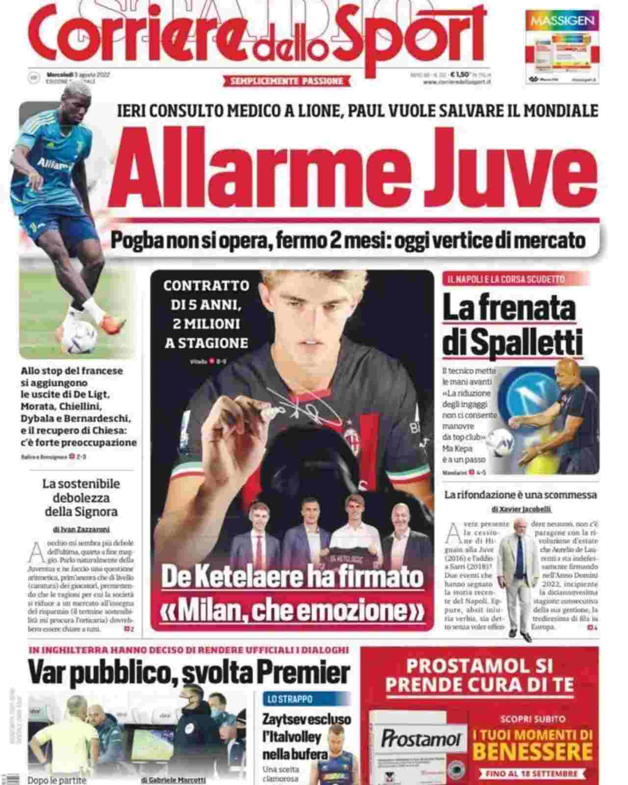 La rassegna stampa di Calciomercato.it vi propone i titoli principali sulla prima pagina di oggi, mercoledì 3 agosto 2022, del ‘Corriere dello Sport’.