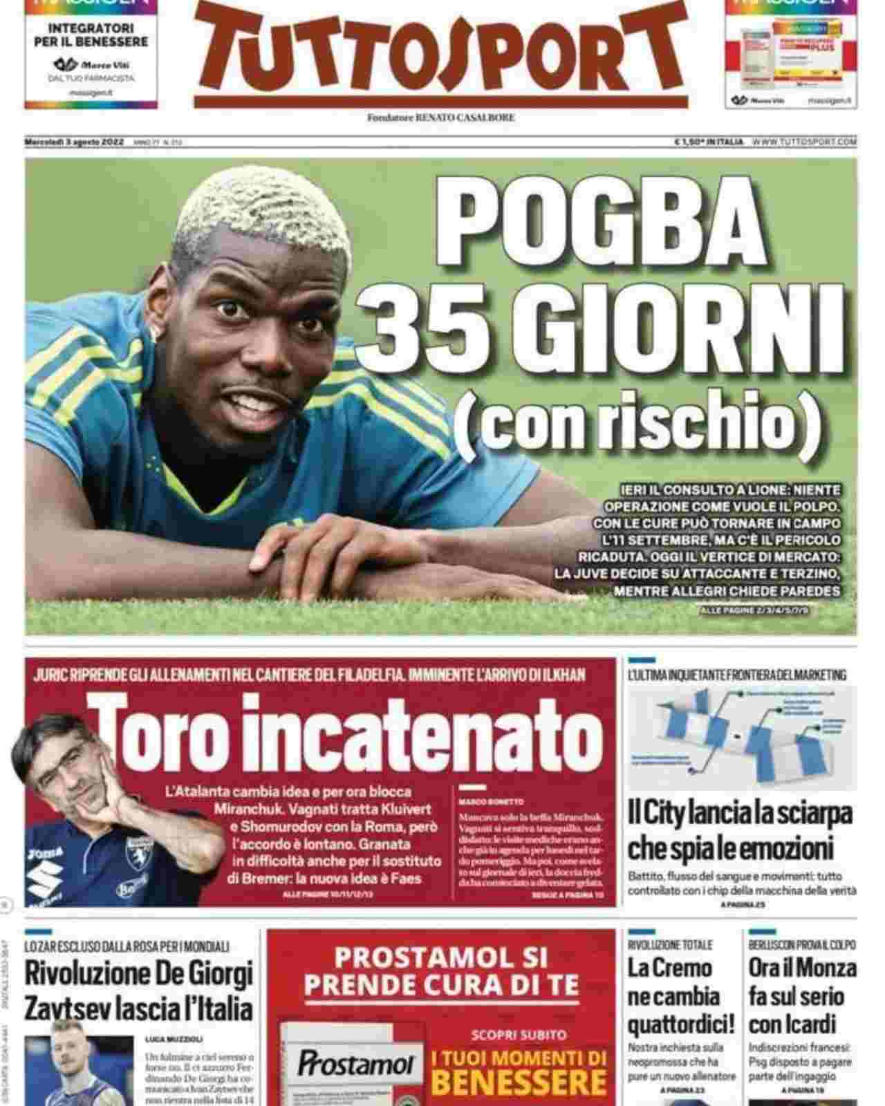 La rassegna stampa di Calciomercato.it vi propone i titoli principali sulla prima pagina di oggi, mercoledì 3 agosto 2022, di ‘Tuttosport’.