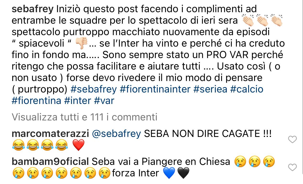 Gli episodi arbitrali hanno ovviamente scaldato gli animi anche sui social. Sebastien Frey, bandiera della Fiorentina ma anche ex Inter, ha commentato in maniera amarissima i due episodi arbitrali: “Come può non essere rosso? Sono sempre stato pro Var, ma mi sto ricredendo”, ha scritto l’ex portiere in una story su Instagram riguardo l’intervento di Dimarco. Poi ha rilanciato con un post in cui ha riportato anche il fallo su Milenkovic. Tra i commenti sono poi spuntati anche Marco Materazzi e Ivan Zamorano: “Seba non dire ca*ate”, scrive Matrix. “Vai a piangere in chiesa, forza Inter”, aggiunge poi il cileno.