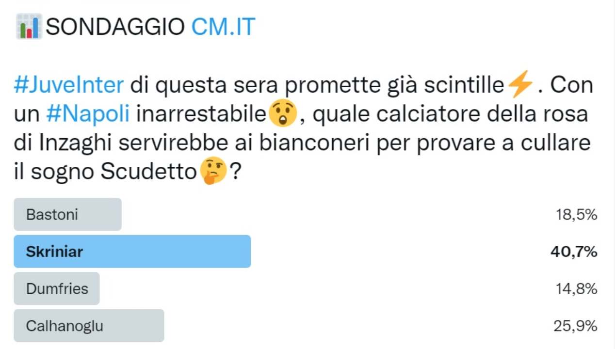 Proprio in vista del big match, Calciomercato.it ha proposto su Twitter un sondaggio con al centro proprio il mercato di gennaio e i possibili affari tra Juventus e Inter. La domanda posta agli utenti è la seguente: “Juve-Inter di questa sera promette già scintille. Con un Napoli inarrestabile, quale calciatore della rosa di Inzaghi servirebbe ai bianconeri per provare a cullare il sogno Scudetto?”