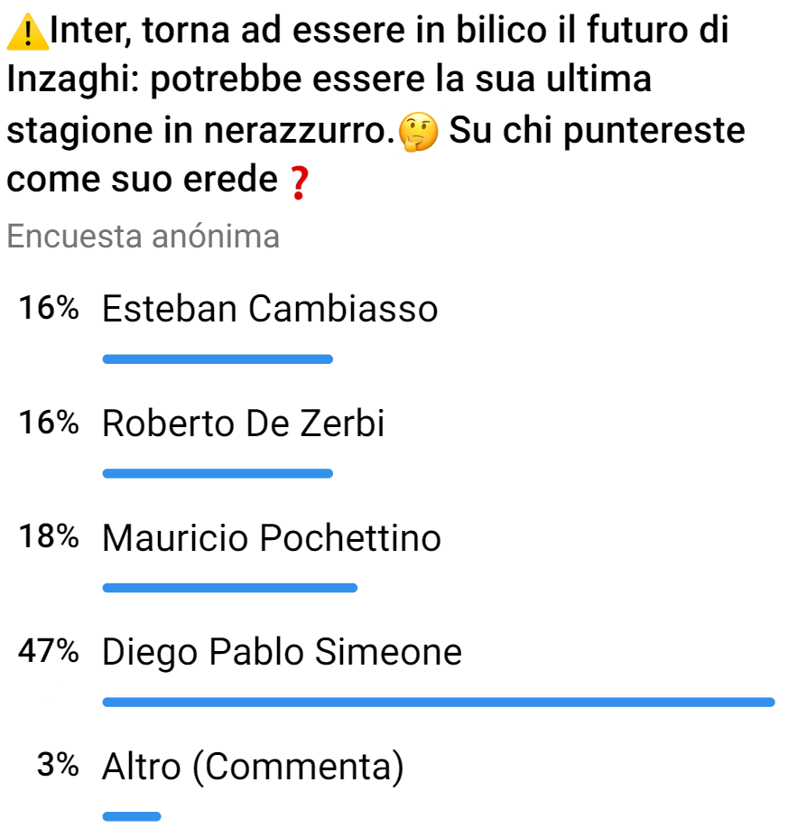 Nel sondaggio lanciato questa mattina sul canale telegram di Calciomercato.it, infatti il nome più votato per la panchina dell’Inter dalla prossima stagione è stato quello di Diego Pablo Simeone con il 47% dei voti. Il tecnico argentino ha surclassato altri due connazionali per il posto in nerazzurro, vale a dire Mauricio Pochettino con il 18% ed Esteban Cambiasso al 16%. Stessa percentuale dell’ex centrocampista dell’Inter, infine, per Roberto De Zerbi, oggi tecnico del Brighton.