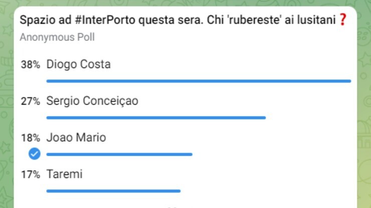 Su Telegram il più votato, con il 38% delle preferenze, è stato il portiere Diogo Costa, estremo difensore a cui è stata consegnata la maglia da titolare durante i Mondiali in Qatar. Il portiere classe 1999 è invece stato scelto dal 21,2% degli utenti su Twitter. Questi ultimi, infatti, hanno assegnato la maggior parte delle preferenze a Mehdi Taremi, centravanti iraniano che in stagione ha già realizzato 19 gol. L’attaccante asiatico è probabilmente l’uomo più pericoloso e il giocatore su cui si focalizzeranno maggiormente le attenzioni dei difensori nerazzurri. Su Telegram però Taremi è stato votato solo dal 17% degli utenti, che gli hanno appunto preferito Diogo Costa.