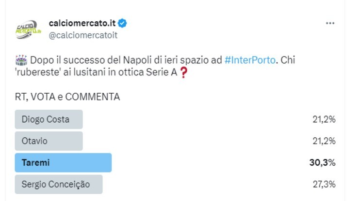 A mettere invece tutti abbastanza d’accordo è il tecnico Sergio Conceiçao. Per molti l’allenatore è il vero valore aggiunto della squadra e sia su Telegram che su Twitter è stato il secondo più votato, raggiungendo rispettivamente il 27% e il 27,3% delle preferenze. Gli utenti di Twitter hanno poi assegnato la preferenza mancante (21,2%) ad Otavio, esterno brasiliano naturalizzato portoghese dotato di ottima tecnica. Su Telegram invece il 18% degli utenti ha votato per Joao Mario, esterno destro a tutta fascia classe 2000, soltanto omonimo dell’ex giocatore dell’Inter ora al Benfica.