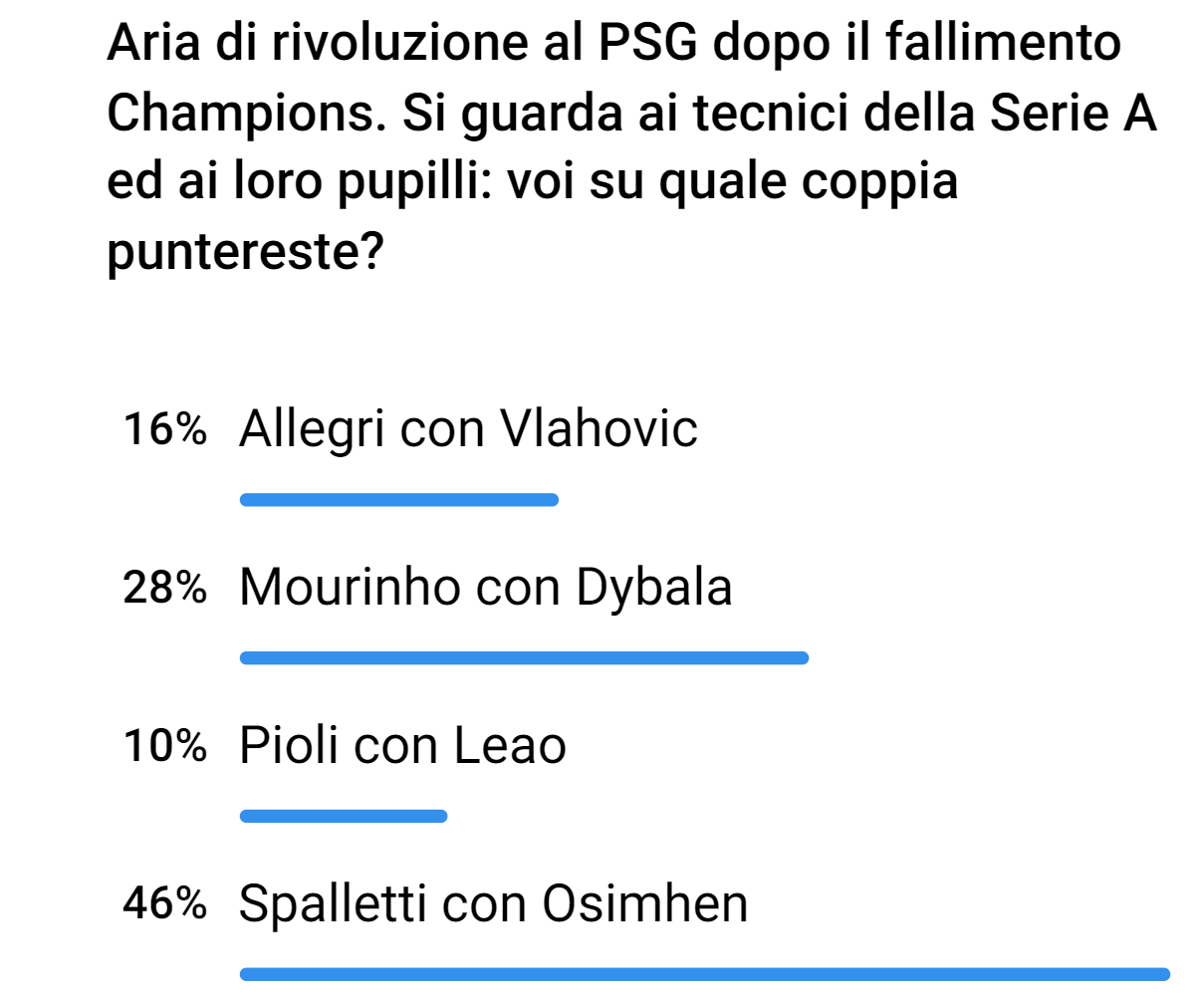 A vincere con una certa distanza di voti è stato il binomio composto da Luciano Spalletti e Victor Osimhen. Sin qui protagonisti sia in Serie A che in Champions, i due del Napoli hanno ottenuto il 46% dei voti. Alle loro spalle un profilo particolarmente gradito al ds Luis Campos come José Mourinho scelto insieme a Dybala al 28%. Alle loro spalle Allegri-Vlahovic al 16% e Pioli-Leao con il 10%.