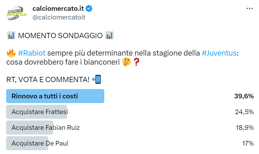 A riprova del grande rapporto esploso in quest’ultima stagione tra Rabiot e la tifoseria bianconera, il ‘rinnovo a tutti i costi’ dell’ex centrocampista del Paris Saint Germain è stato votato su Twitter dal 39,6% degli utenti. Come seconda opzione del sondaggio è stato invece indicato l’acquisto di Davide Frattesi, centrocampista italiano di proprietà del Sassuolo.