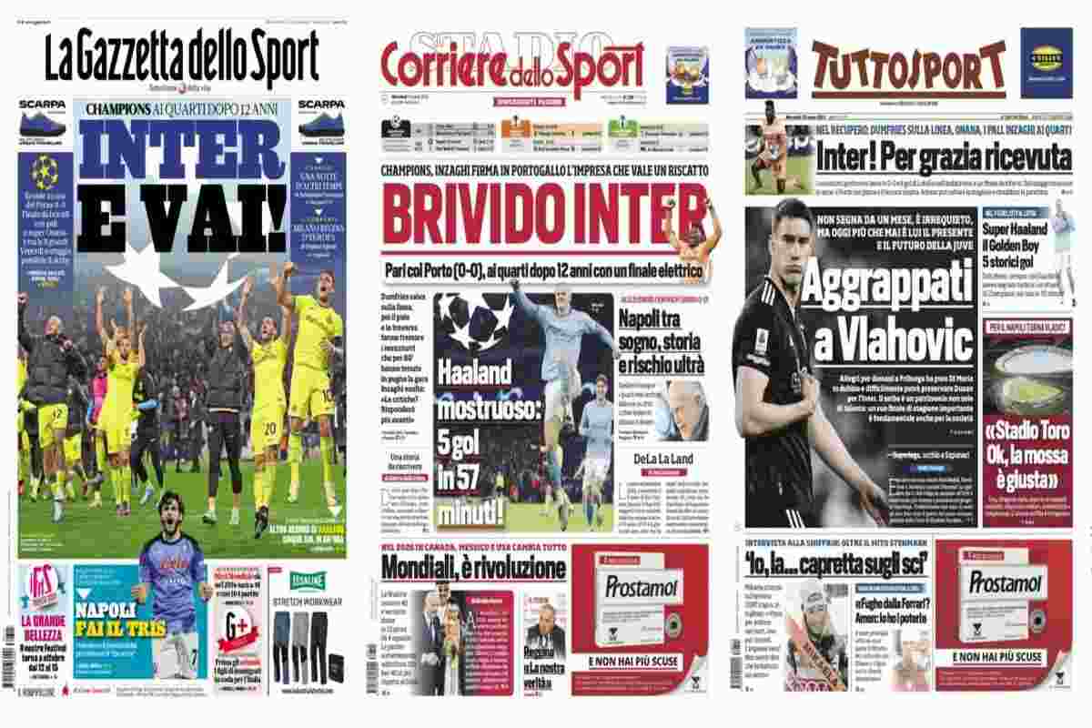 Seconda squadra italiana ai quarti di finale di Champions League, dopo il Milan. Ce la fa anche l’Inter, con la ‘Gazzetta dello Sport’ a titolare “Inter, e vai” dopo il pari con il Porto che vale il pass. “Napoli, fai il tris” è l’incoraggiamento agli azzurri a passare a sua volta stasera il turno con l’Eintracht.