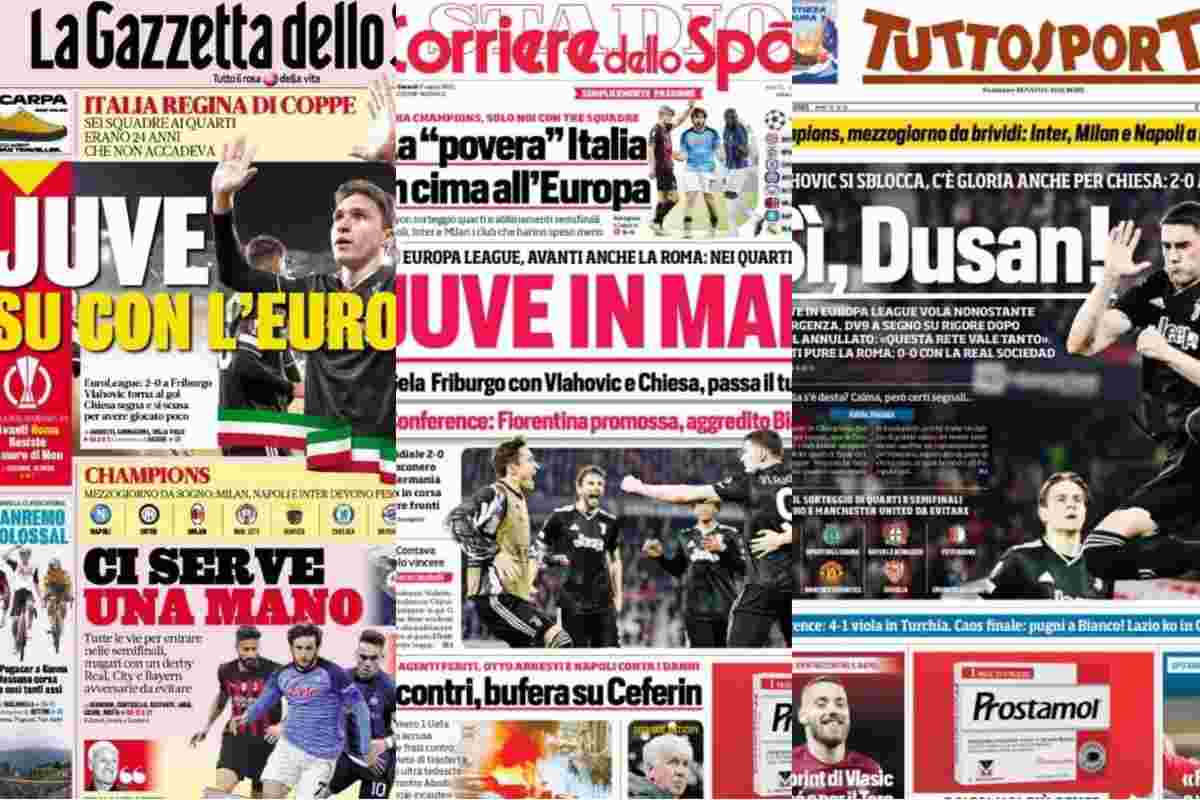 La prima pagina de ‘La Gazzetta dello Sport’ è dedicata alla Juventus e alle italiane in Europa e Conference League: si qualificano ai quarti i bianconeri, Roma e Fiorentina. L’unica eliminata è la Lazio di Maurizio Sarri, per mano dell’AZ Alkmaar. Spazio anche ai sorteggi odierni: alle ore 12 si scopriranno le avversarie ai quarti di Champions di Milan, Inter e Napoli nel sorteggio di Nyon.