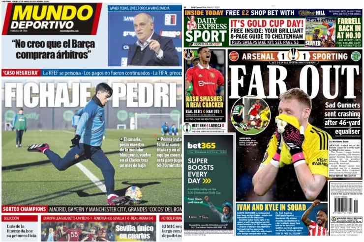 Il ‘Mundo Deportivo’, quotidiano spagnolo vicino al Barcellona, si proietta al Clasico col Real Madrid. Xavi ritrova Pedri per la sfida che potrebbe decidere definitivamente la Liga. In Inghilterra, in particolare sul ‘Daily Express’, spazio dedicato al flop dell’Arsenal di Arteta. La capolista della Premier è eliminata ai rigori dall’Europa League. Lo Sporting vola ai quarti.