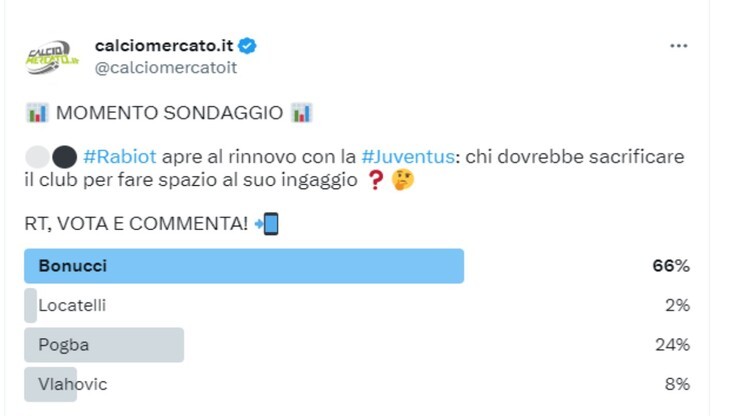 A tal proposito, visto l’aumento dell’ingaggio per il francese, abbiamo chiesto sul nostro account Twitter di quale giocatore la Juventus dovrebbe privarsi per ottenere quel tesoretto da utilizzare per il rinnovo di Rabiot. E la scelta è stata piuttosto unanime: il 66% ritiene che la Juve debba sbarazzarsi di Leonardo Bonucci per fare in modo di avere i soldi necessari al rinnovo del centrocampista transalpino.