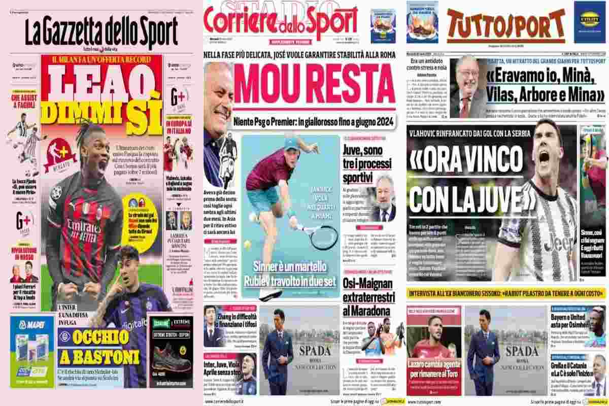 La ‘Gazzetta dello Sport’ apre con lo sprint del Milan per il rinnovo di Leao: “Leao dimmi di sì“, spingendosi a un’offerta di oltre 7 milioni l’anno e chiedendo una risposta entro Pasqua. L’Inter, invece, teme per un nuovo caso Skriniar con il rinnovo complicato di un altro big: “Occhio a Bastoni“.