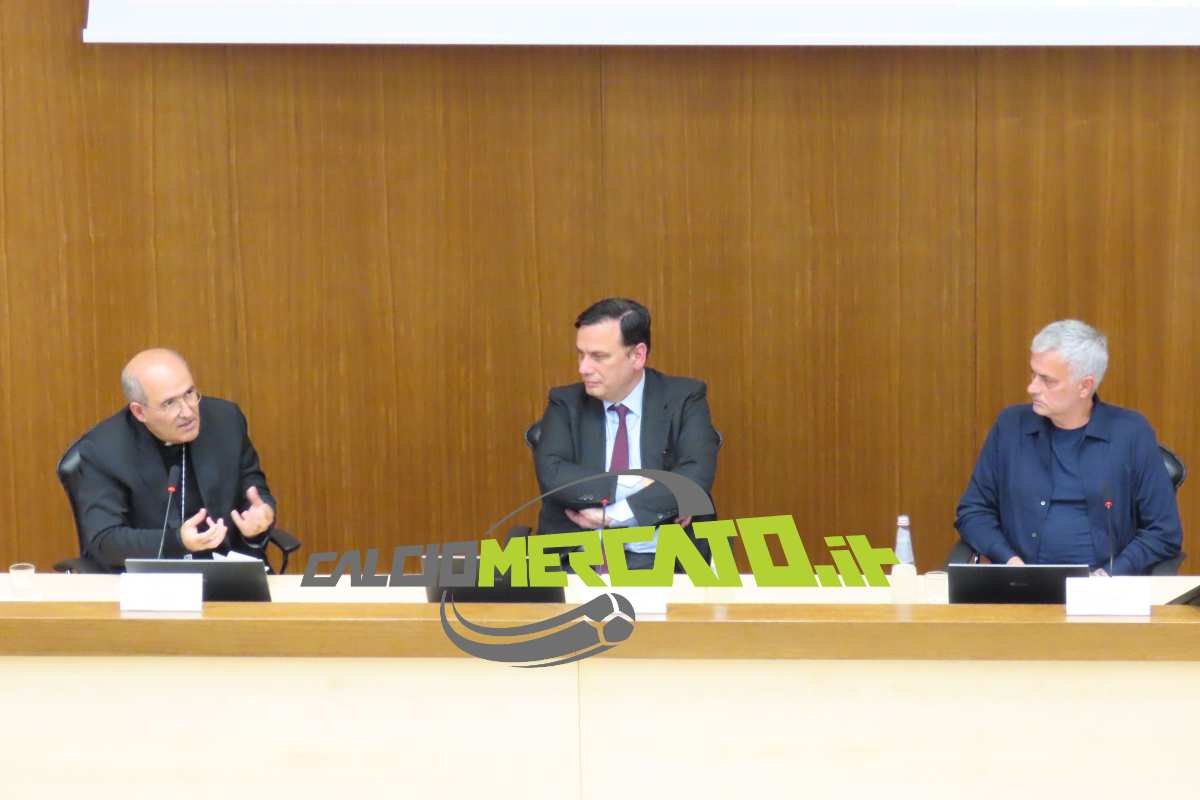 Presso la Pontificia Università Gregoriana, l’allenatore della Roma è tornato a incontrare il cardinale José Tolentino de Mendonca, nei giorni dei 10 anni di pontificato di Papa Francesco (che domani sarà dimesso dal ‘Gemelli’) e nell’ambito di una serie di momenti dedicati a ‘Camminando verso Lisbona’. Ovvero la sede della prossima Giornata Mondiale della Gioventù. Dopo un colloquio privato di circa 40 minuti, Mourinho e Mendonca – prefetto del Dicastero per la cultura e l’educazione – si sono seduti nell’Aula Magna, parlando liberamente di ragazzi e di formazione. Un momento importante a cui ha assistito anche il ministro dello Sport Andrea Abodi (tra gli auditori anche Nuno Santos). Di seguito il botta e risposta integrale, poi dopo la conversazione c’è stata una vera e propria ressa dove Mourinho si è fermato a salutare Abodi e firmare autografi e scattare selfie uno dopo l’altro.