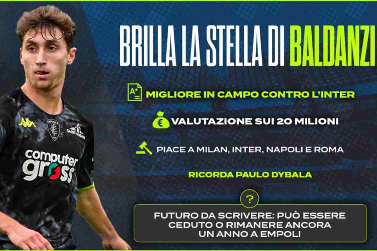 Tra questi, certamente Tommaso Baldanzi. 20 anni compiuti appena da un mese, ma già movenze da fuoriclasse in potenza, che ricordano molto quelle di uno come Paulo Dybala. Un accostamento senza dubbio importante, ma che il giovane fantasista dell’Empoli si è meritato a suon di prestazioni importanti e con numeri che certificano un talento in rampa di lancio, pronto ad esplodere. Quattro gol in stagione, tra cui quello bello e pesantissimo di fine gennaio a San Siro contro l’Inter, che ha regalato una vittoria prestigiosa ai toscani allenati da Zanetti. Le cose sono andate piuttosto diversamente domenica, quando i nerazzurri si sono vendicati passando per 3-0 al ‘Castellani’. Per gli azzurri, in un girone di ritorno da appena 7 punti, la situazione si sta complicando: sono solo sei i punti di vantaggio sul Verona terzultimo. Ma anche domenica, Baldanzi è stato il migliore tra i suoi e sul suo talento i toscani possono puntare per raggiungere i punti mancanti al traguardo salvezza. E intanto, gli appetiti delle squadre di Serie A sono pronti a scatenarsi.