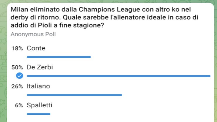 Il tecnico, nel caso in cui non dovesse centrare la qualificazione in Champions, potrebbe infatti salutare a fine stagione. A tal proposito nel sondaggio pubblicato sul nostro canale Telegram abbiamo chiesto proprio quale sarebbe il tecnico più adatto a sostituire l’allenatore emiliano alla guida dei rossoneri. Per il 50% non c’è dubbio, la scelta giusta si chiama Roberto De Zerbi. L’allenatore italiano sta facendo benissimo al Brighton e strapparlo agli inglesi non sarà facile, specialmente dopo questa stagione. Chi è al momento senza squadra dopo l’addio al Tottenham è invece Antonio Conte.