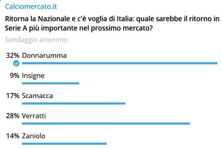 Nel nostro consueto sondaggio quotidiano su Telegram, noi di Calciomercato.it abbiamo chiesto agli utenti quale sarebbe il rientro dall’estero più importante per il campionato italiano. Proprio Donnarumma ha prevalso, con il 32% delle preferenze, superando di poco Verratti, suo compagno di squadra a Parigi (28%). Decisamente meno gettonati i ritorni di Scamacca (17%), Zaniolo (14%) e Insigne (9%).