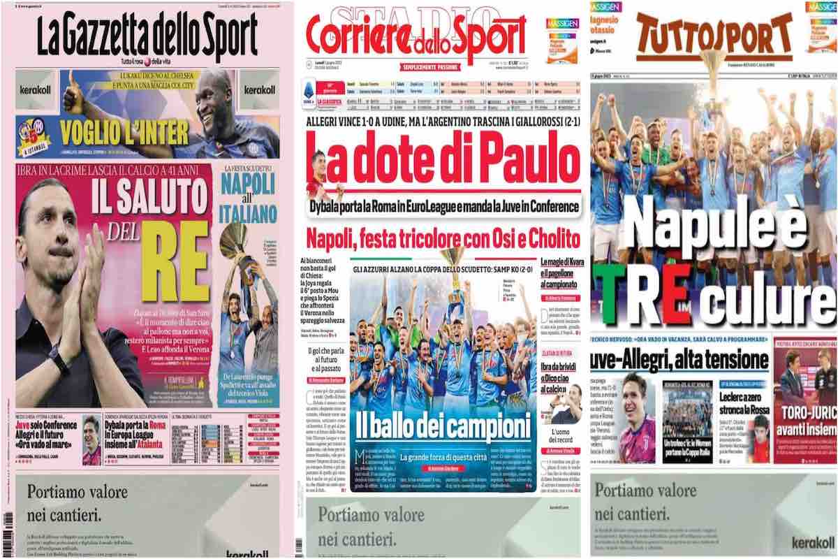 La Gazzetta dello Sport apre con l’addio di Zlatan Ibrahimovic: “Il saluto del Re“. Ibra in lacrime, lascia il calcio a 41 anni: “Resterò milanista per sempre“. Lukaku dice no al Chelsea e punta a una maglia col City: “Voglio l’Inter“. Festa scudetto: “Napoli all’Italiano“, De Laurentiis punge Spalletti e va all’assalto del tecnico viola”. Juve solo Conference, Allegri e il futuro: “Ora vado al mare”. Dybala porta la Roma in Europa League insieme all’Atalanta.