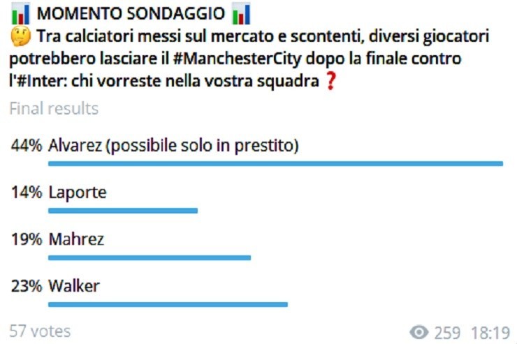 Tra i possibili nomi in uscita dal City, abbiamo chiesto nel consueto sondaggio sul canale Telegram di Calciomercato.it quale gli utenti preferirebbero vedere in Serie A. Con un verdetto piuttosto netto in proposito.