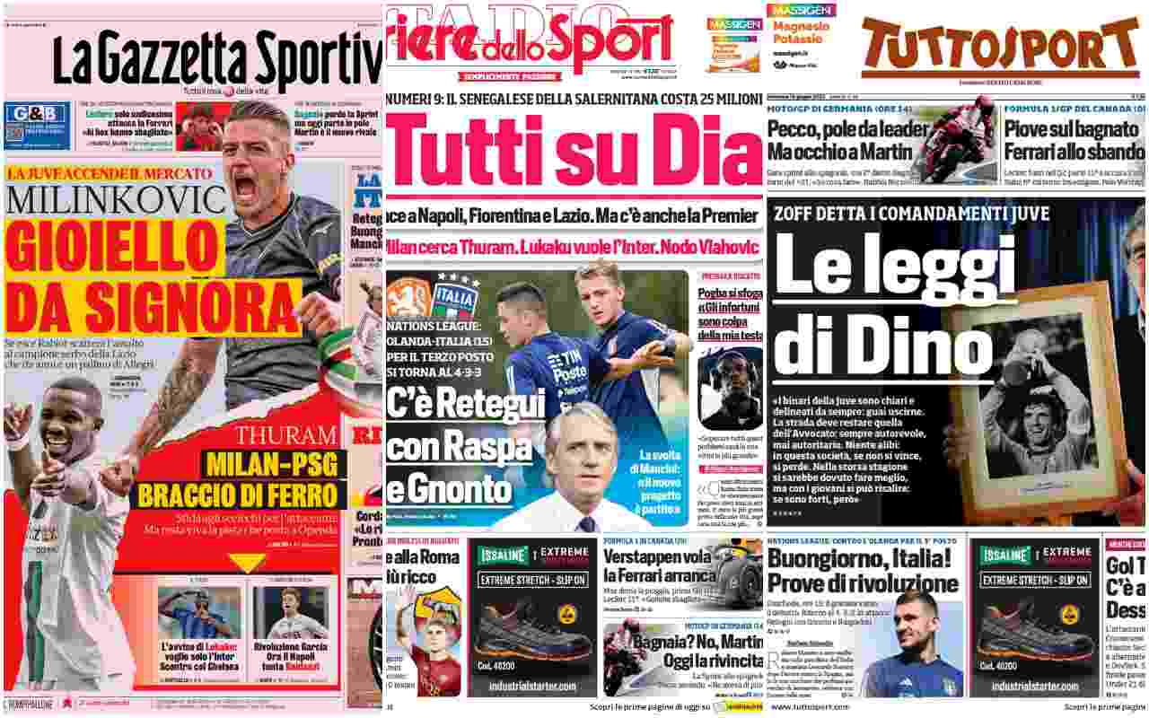 La Gazzetta dello Sport dedica la prima pagina al mercato della Juventus: “MILINKOVIC GIOIELLO DA SIGNORA”. Il Sergente della Lazio potrebbe essere il rinforzo ideale per il centrocampo bianconero, sopratutto in caso di addio di Adrien Rabiot. Grande spazio anche al mercato rossonero: “Thuram, Milan-PSG braccio di ferro”. Non restano a guardare i cugini: “L’avviso di Lukaku: voglio solo l’Inter. Scontro col Chelsea“. I campioni d’Italia, intanto, si apprestano ad un restyling: “Rivoluzione Garcia, ora il Napoli tenta Baldanzi“. Gli altri titoli di giornata: “La nuova Italia”; “Rivera, cordata per il Bari: Lo riportiamo in A, pronto ad allenare”.