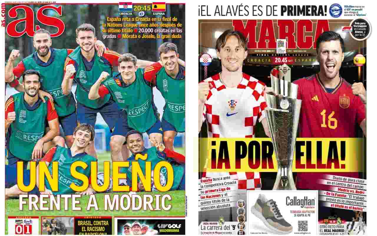 Restiamo in Spagna, dove il quotidiano AS titola “UN SUENO FRENTE A MODRIC“. Questa sera andrà in scena la finale di Nations League tra Spagna e Croazia, dopo aver battuto gli Azzurri gli spagnoli possono mettere in bacheca un altro trofeo. Anche Marca titola sulla finale: “A POR ELLA!”.