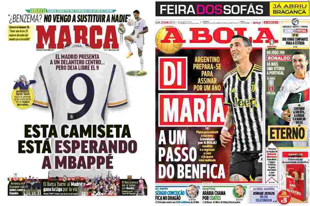 Il Real Madrid accoglie Joselu, ma lascia ancora libero il numero 9. Su ‘Marca’, titolo esplicito: “Esta camiseta està esperando a Mbappé“. Mentre in Portogallo si attende un grande ritorno, come illustrato da ‘A Bola’: “Di Maria a um passo do Benfica“.
