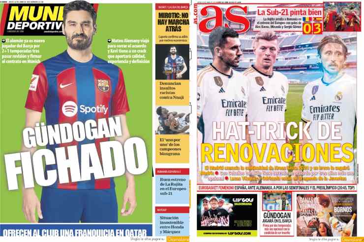 Attenzione in casa catalana per l’arrivo di un top player a zero. ‘Gundogan ingaggiato’, si legge in prima pagina su ‘Mundo Deportivo’ con tanto di centrocampista già in completo azulgrana. Su ‘AS’, invece, ‘Hat-trick de renovaciones’ per il Real Madrid ovvero tripletta di rinnovi con le tre immagini di Ceballos, Kroos (ufficiale da ieri) e Modric.