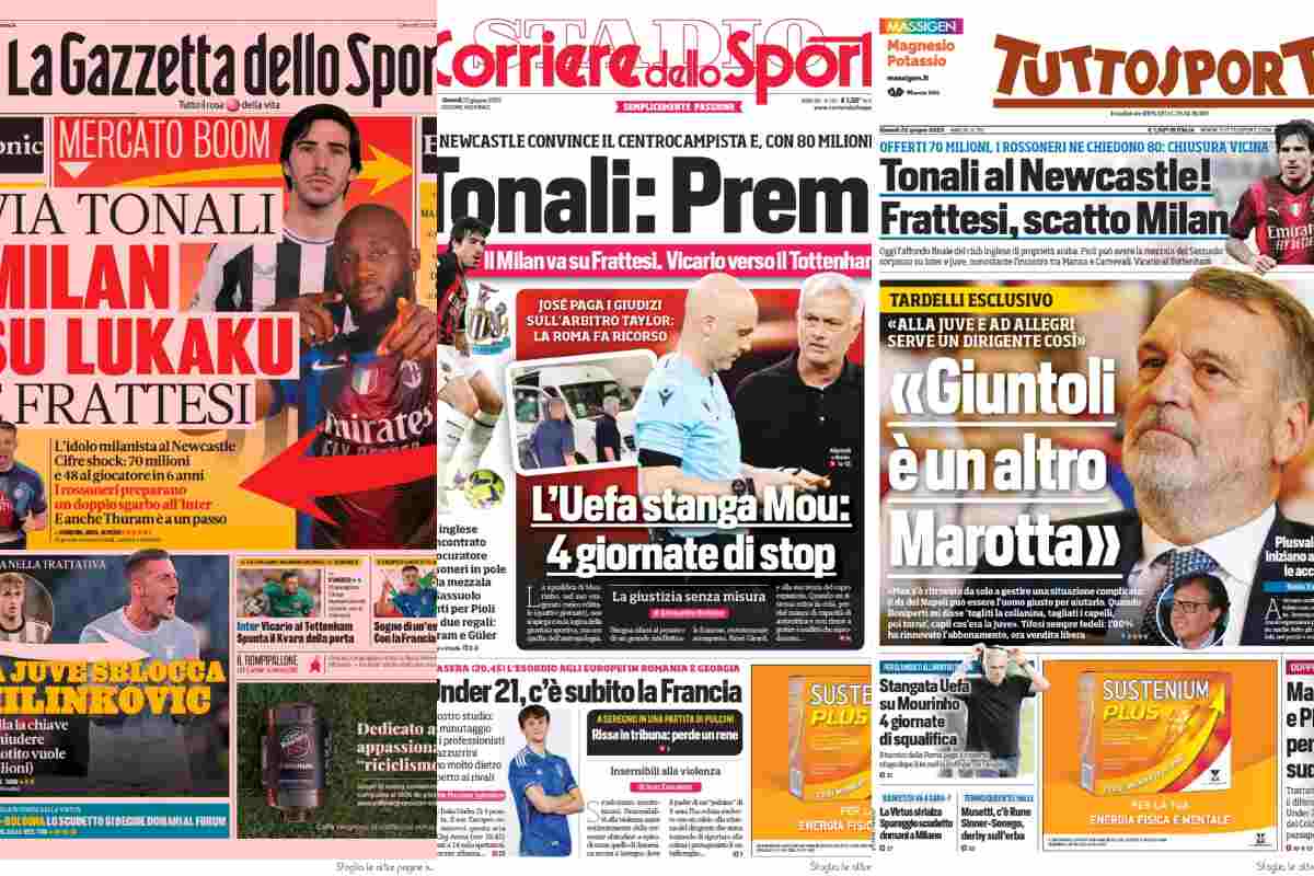 Come ovvio che sia la notizia del giorno su tutti i quodiani è la cessione probabilissima di Sandro Tonali al Newcastle. Su ‘La Gazzetta dello Sport’ compare la figura del centrocampista con già indosso la maglia bianconera: “Via Tonali. Milan su Lukaku e Frattesi’, scrive in prima pagina la rosea. E appunto insieme vicecapitano rossonero c’è proprio Big Rom che ha parte di maglia Inter e parte Milan. Poi in tagllo basso ‘La Juve sblocca Milinkovic’ con ‘Rovella la chiave per chiudere (ma Lotito vuole 40 milioni). E ancora l’Inter: ‘Vicario al Tottenham. Spunta il Kvara della porta’. Ovvero Mamardashvili. E infine la presentazione dell’esordio azzurro all’Europeo under 21: “Sogno di un’estate azzurrina. Con la Francia è già una finale’.