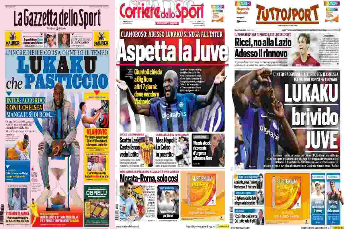 C’è un protagonista unico sulle tre prime pagine dei quotidiani sportivi nostrani, ed è Romelu Lukaku, attorno al quale non mancano i colpi di scena. L’Inter continua a inseguirlo, ma manca il suo assenso e addirittura l’ipotesi Juventus adesso andrebbe per la maggiore. “Lukaku, che pasticcio“, è l’apertura della ‘Gazzetta dello Sport’, con il ‘Corriere dello Sport’ che in riferimento al belga scrive “Aspetta la Juve“: l’altro protagonista è Vlahovic, la cui cessione spalancherebbe le porte dei bianconeri a Lukaku. Il riassunto di ‘Tuttosport’ è “Lukaku, brivido Juve“.