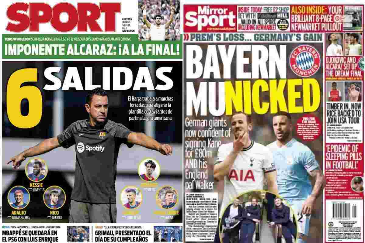 Su ‘Sport’, in Spagna, il piano delle cessioni del Barcellona, “6 salidas“, tra le quali quella di Kessie alla Juventus. In Inghilterra invece si osservano con preoccupazione le mosse del Bayern, pronto a mettere le mani su Kane e Walker: “Bayern MuNicked” è il titolo del ‘Mirror’.