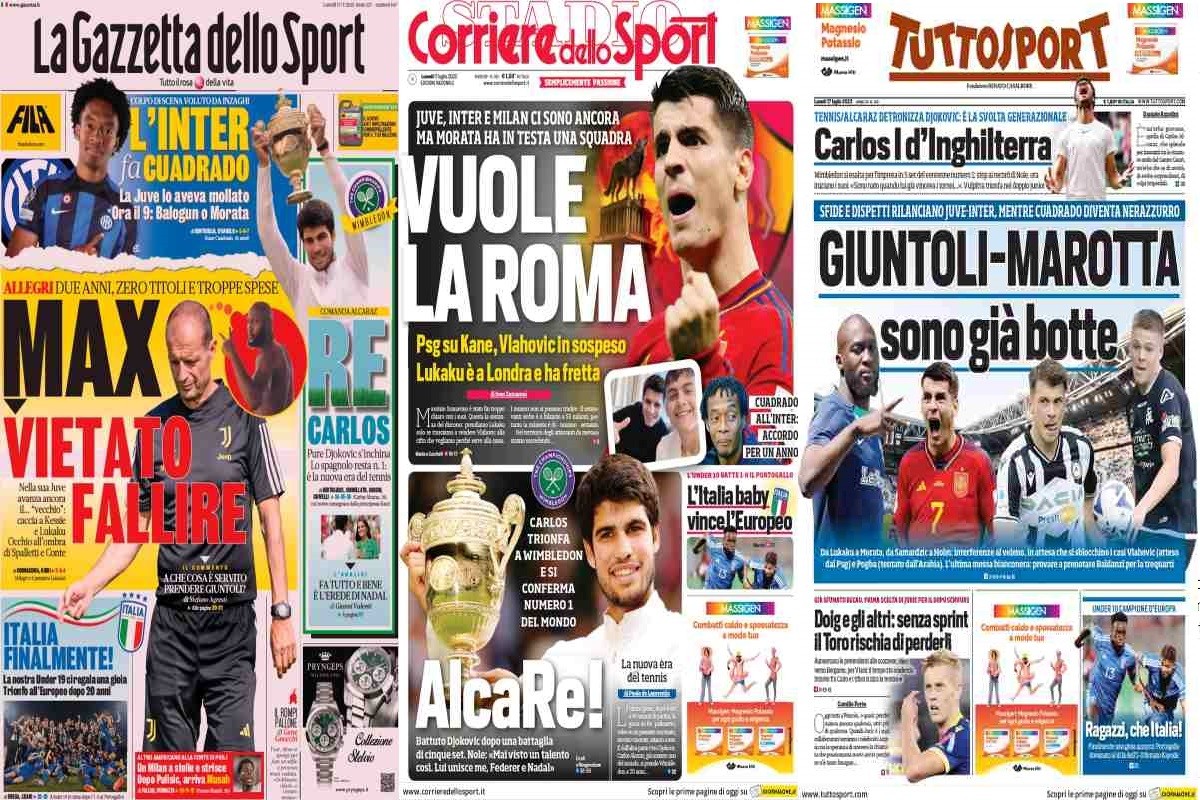 Le vicende di calciomercato prima del via della stagione continuano a tenere banco sui quotidiani nostrani. La ‘Gazzetta dello Sport’ titola ‘avvertendo’ la Juventus e Allegri, chiamate a non sbagliare: “Max, vietato fallire“. Intanto, l’Inter piazza il colpo a sorpresa: “L’Inter fa Cuadrado“. L’evento della domenica sportiva però è un altro: la vittoria di Alcaraz a Wimbledon (“Re Carlos“). Mentre l’Italia calcistica può sorridere con la vittoria dell’Under 19 nella finale europea contro il Portogallo: “Italia finalmente!“.