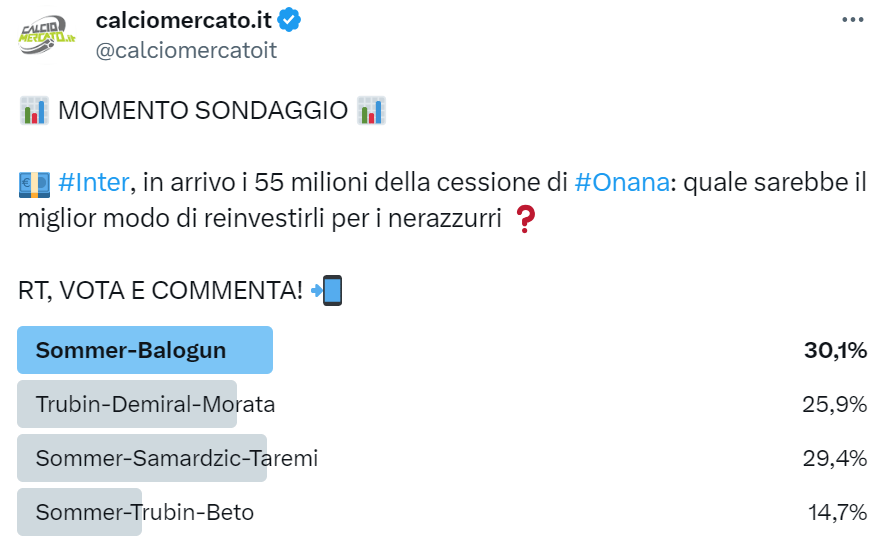 Nel sondaggio di oggi abbiamo chiesto agli utenti di Calciomercato.it su quali obiettivi dovrebbe puntare l’Inter dopo la cessione di Onana.