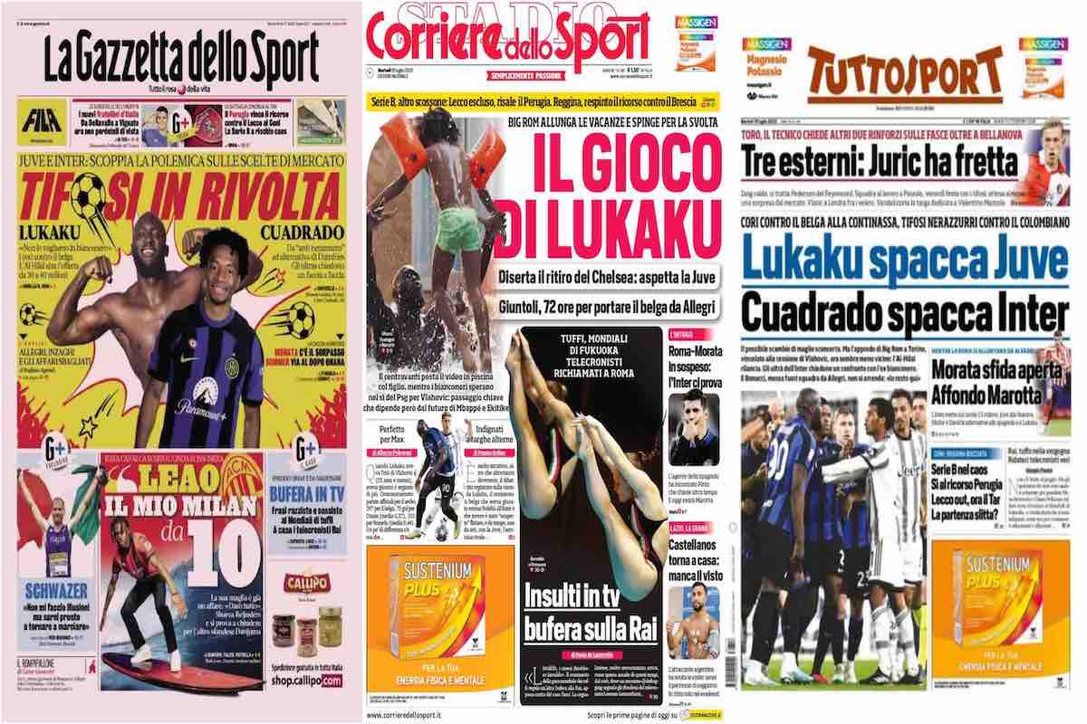 “Il gioco di Lukaku”, questo il titolo principale sul Corriere dello Sport. Big Rom allunga le vacanze e diserta il ritiro del Chelsea: aspetta la Juve. Roma-Morata in sospeso: l’Inter ci prova. Castellanos torna a casa: manca il visto.