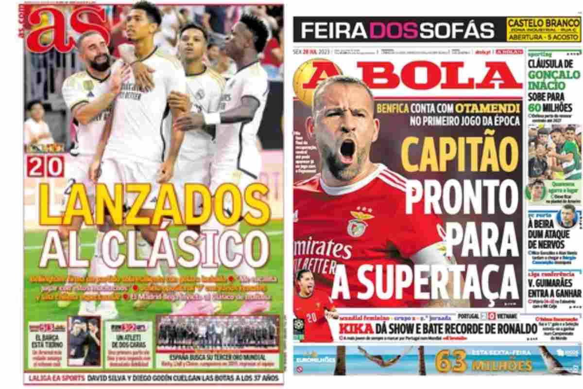 Il quotidiano spagnolo AS apre con la prossima amichevole tra Real Madrid e Barcellona. Antipasto di Clasico in terra americana, con i Blancos che affronteranno nei prossimi giorni anche la Juve di Allegri. Infine, in Portogallo A Bola fa un focus sul Benfica, sempre capitanato da Otamendi.
