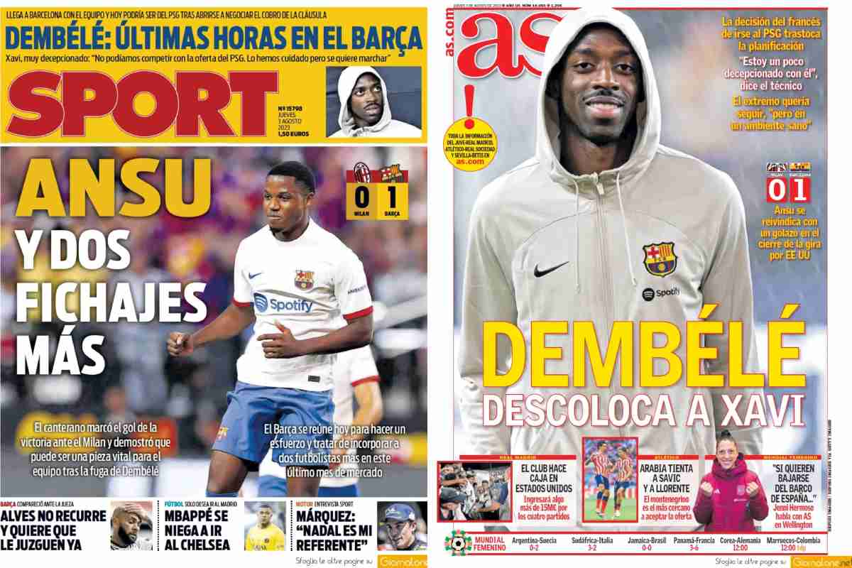 In Spagna si parla del mercato del Barcellona: ‘Ansu e altri due acquisti’, titola ‘Sport’ raccontando come i blaugrana – dopo aver ritrovato Fati – sono pronti a fare uno sforzo per altri due acquisti. Su ‘AS’, invece, si titola con ‘Dembele sconvolge Xavi’. Il tecnico deluso dalla decisione del francese di andare via e scegliere il PSG. Intanto l’Arabia tenta anche Savic e Llorente dell’Atletico Madrid.