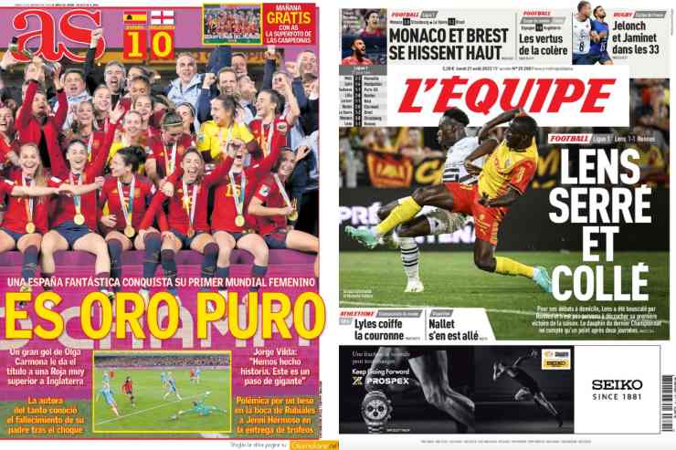 Su ‘AS’ e tutti gli altri quotidiani spagnoli si celebra giustamente la grande vittoria della Spagna, che si aggiudica il suo primo Mondiale femminile grazie alla vittoria contro l’Inghilterra. In Francia invece ‘L’Equipe’ titola ‘Lens chiuso e incollato’, due aggettivi che si associano facilmente a una squadra che ieri ha pareggio 1-1 col Rennes e, dopo il secondo posto dell’anno scorso, è ancora a caccia della prima vittoria.