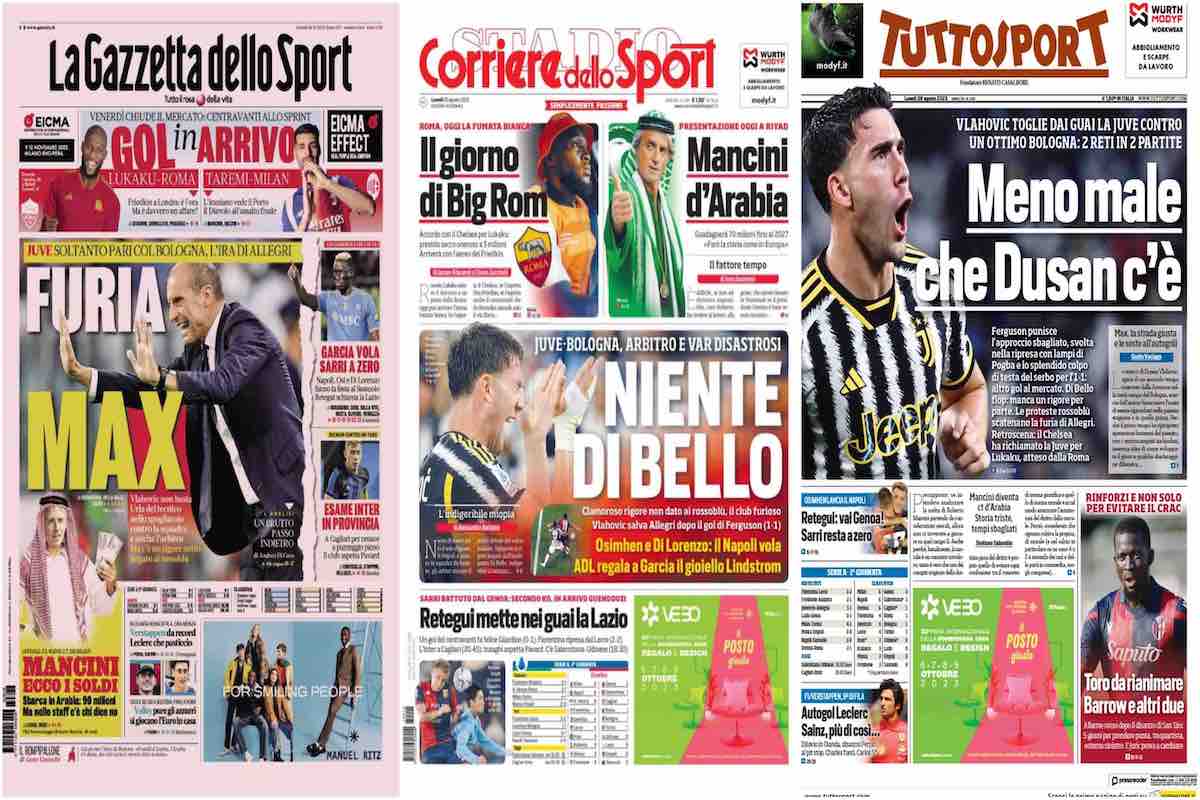 L’apertura della Gazzetta dello Sport: “Furia Max“. Juve, soltanto pari con il Bologna: l’ira di Allegri. Gol in arrivo: Lukaku-Roma e Taremi-Milan. Garcia vola, Sarri a zero. Esame Inter in provincia: Inzaghi intanto aspetta Pavard. Mancini: ecco i soldi.