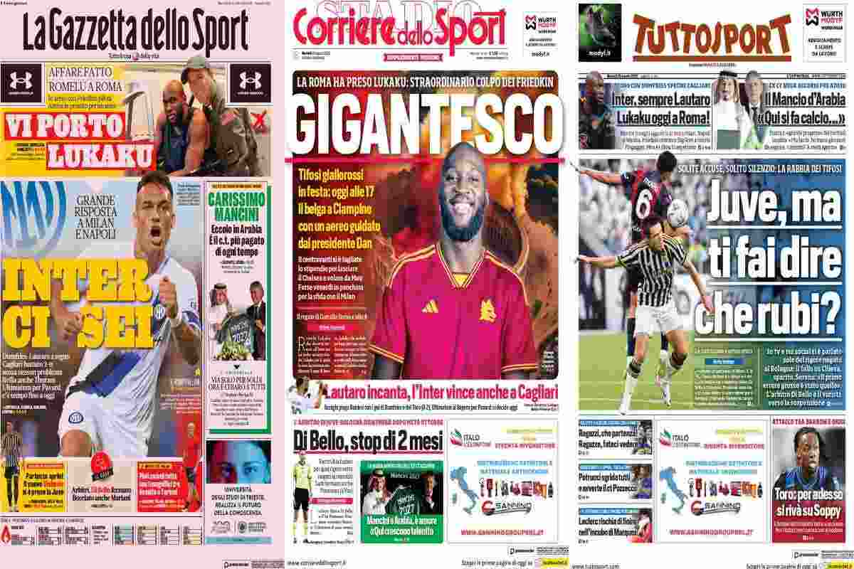 Sul ‘Corriere dello Sport’, titolo dedicato al colpo Lukaku per la Roma: “Gigantesco“. “Lautaro incanta, l’Inter vince anche a Cagliari” racconta il successo nerazzurro nel posticipo del lunedì. “Di Bello, stop di due mesi” è la decisione dell’Associazione Italiana Arbitri dopo il disastro del direttore di gara in Juventus-Bologna.
