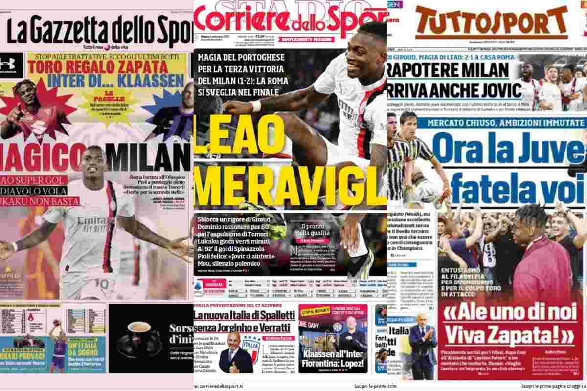 La prima pagina de La Gazzetta dello Sport è dedicata al “magico Milan“. Terza vittoria consecutiva, punteggio pieno e un’altra prestazione molto convincente all’Olimpico contro una spenta Roma. Giroud e Leao rovinano l’esordio di Romelu Lukaku e Mourinho diserta il post partita: silenzio stampa dei giallorossi, che protestano per il rigore assegnato nel primo tempo. Anche sul Corriere dello Sport è “Leao meravigliao”. Il portoghese con un altro gioiello all’Olimpico.