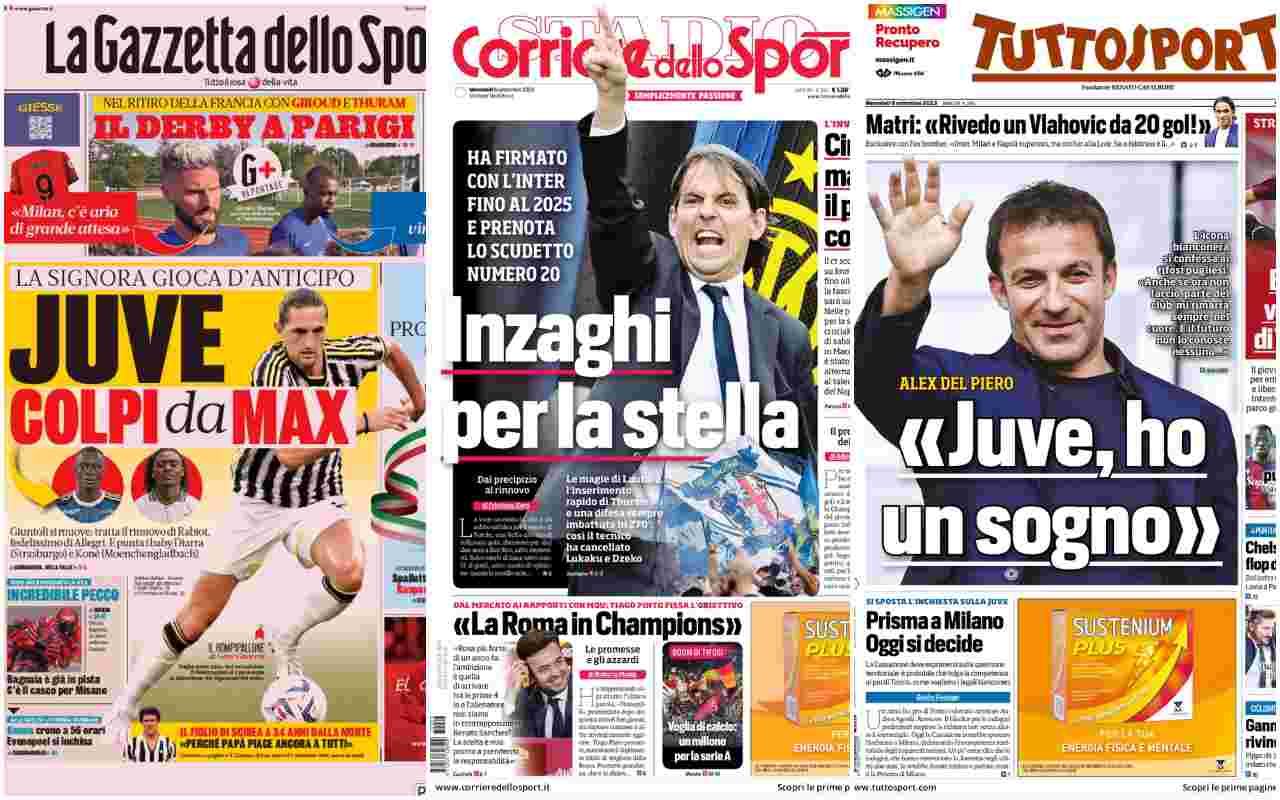 Terminato il calciomercato e con le prime tre giornate di campionato, La Gazzetta dello Sport apre con la programmazione in casa Juventus: “JUVE COLPI DA MAX”. Spazio anche al ricordo di Gaetano Scirea con l’intervista al figlio a 34 anni dalla sua morte: “Perché papà piace ancora a tutti”. Il taglio alto è dedicato al derby della Madunina che andrà in scena dopo la sosta per le nazionali: “Il Derby a Parigi”, con Giroud e Thuram compagni di squadra con la Francia. In Nazionale, invece, arriva un importante endorsement per Buffon: “Gigi promuove Gigi”, con Gigi Riva che ha apprezzato la scelta della Federazione.