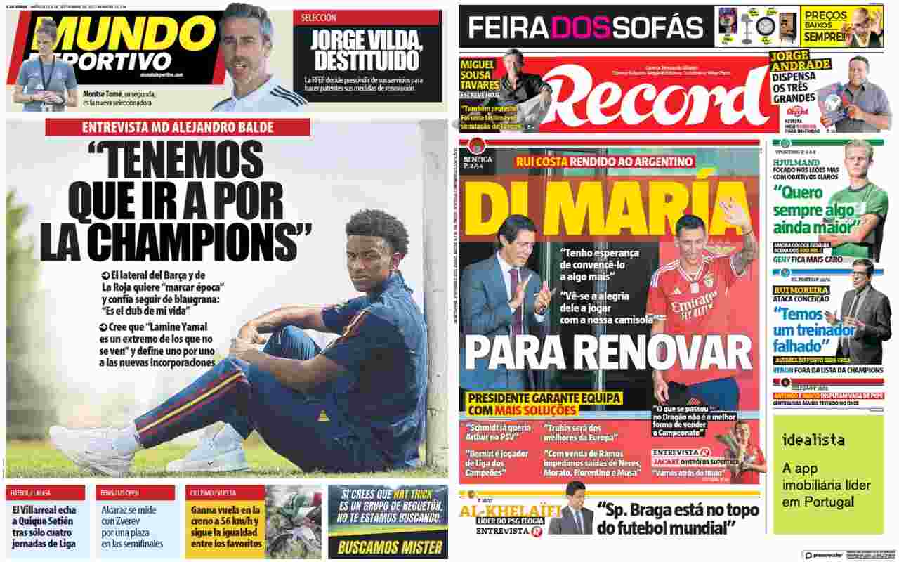 In Spagna, Mundo Deportivo apre con l’intervista ad Alejandro Balde: “TENEMOS QUE IRA A POR LA CHAMPIONS”. In Portogallo, invece, Record mette in prima pagina il futuro del Fideo: “DI MARIA PARA RENOVAR”. Dopo una stagione difficile a Torino, l’argentino ha ritrovato la serenità con il Benfica.