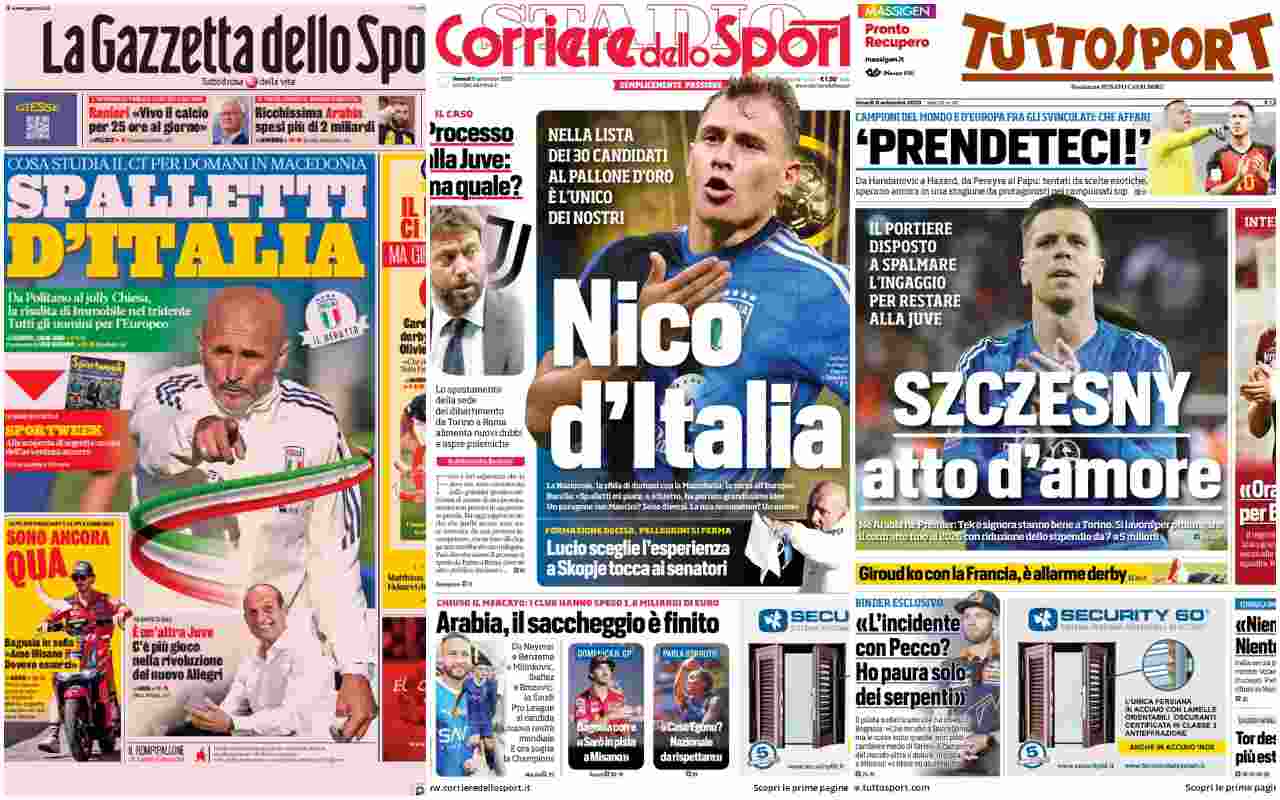 Alla vigilia dell’esordio della prima Nazionale di Luciano Spalletti, La Gazzetta dello Sport dedica la prima pagina agli Azzurri: “SPALLETTI D’ITALIA“. Il taglio laterale della Rosea, invece, è già proiettato al Derby della Madonnina che andrà in scena al ritorno della sosta per le nazionali: “Il Milan ci crede, ma Giroud va KO”. Anche a Torino c’è ottimismo sulla stagione: “È un’altra Juve, c’è più gioco nella rivoluzione del nuovo Allegri“. Gli altri titoli di giornata: “Ranieri, vivo il calcio per 25 ore al giorno”; “Ricchissima Arabia, spesi più di 2 miliardi”; “Sono ancora qua”.