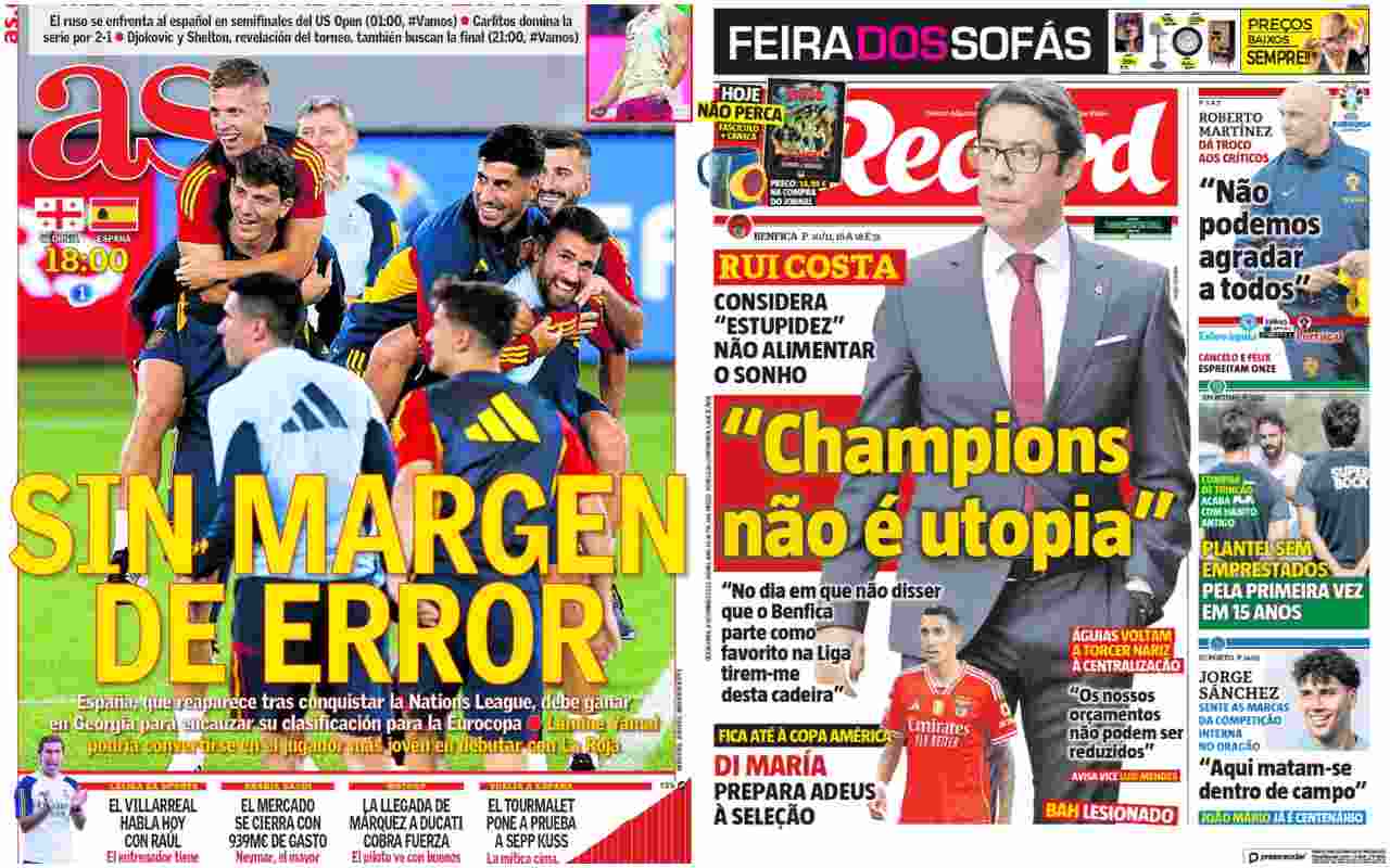 In Spagna, AS avvisa la nazionale iberica: “SIN MARGEN DE ERROR”. In Portogallo, invece, Record apre con l’intervista esclusiva a Rui Costa. Il dirigente del Benfica fa sognare i tifosi: “CHAMPIONS NAO È UTOPIA”.
